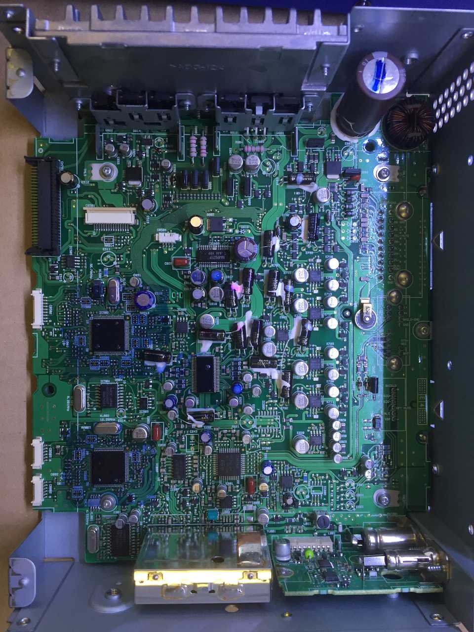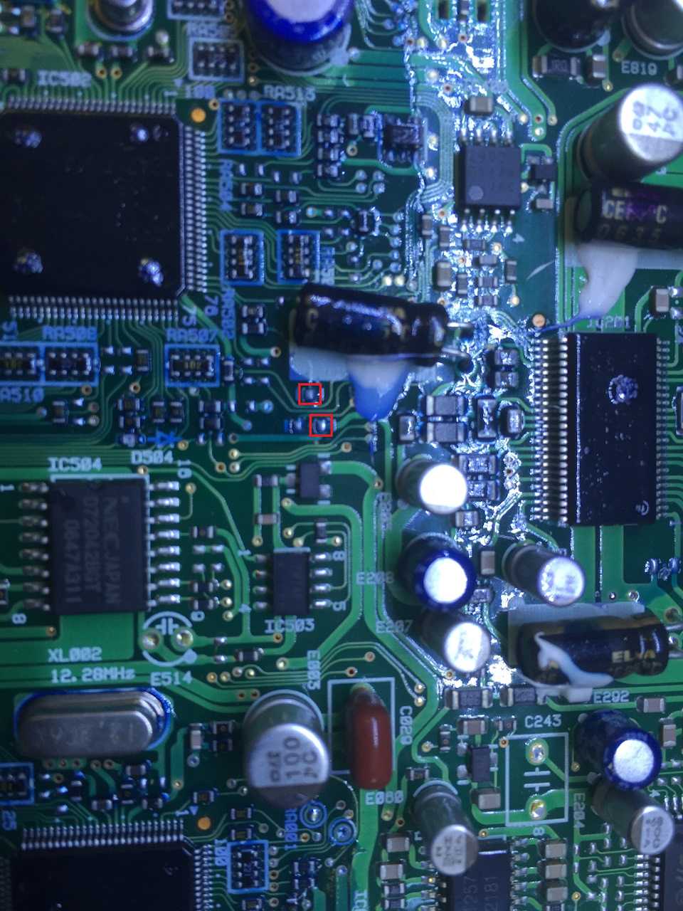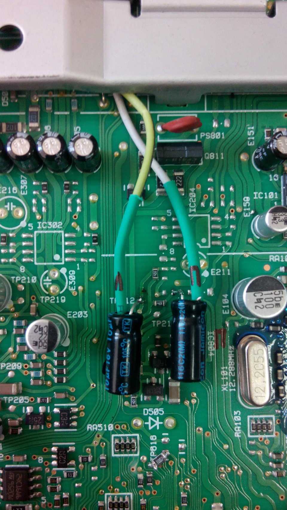 Затем найти места подключения электролитических конденсаторов для левого и правого каналов звука, как показано на следующем фото