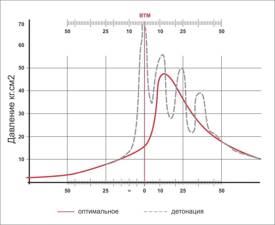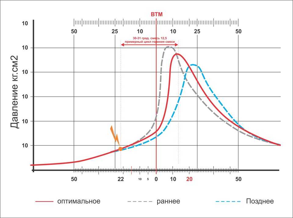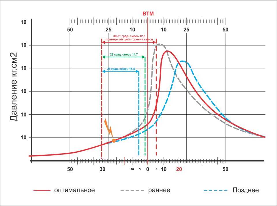 На холостом ходу понятно все хорошо и смесь 14,7но ситуация изменится когда хотябы один из факторов изменитьсясмесь теперь у нас 12,5:1 и скорость горения у нее больше 30-31см/сиз теории. смесь будет гореть 30-31 градуса коленвала.а это значит нужно зажечь смесь примерно на 20-22 градуса до ВТМи это примерно подтверждает данная схемка. влияние угла опережения