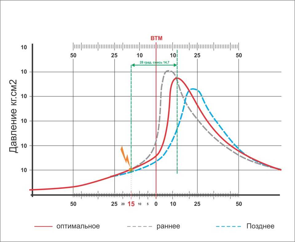 Опираясь на теорию при зажигании в 15градусах до ВТМ смесь сгорит именно в 10-12 градусахпосле ВТМ где и есть золотая середина и максимальное давление в камере сгорания.