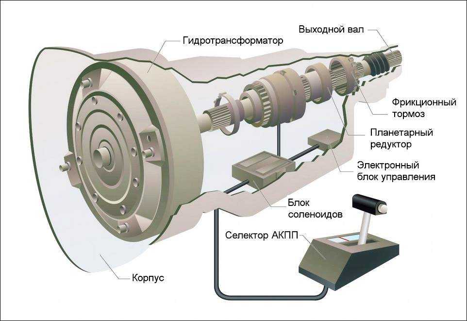 АКПП используют гидромеханический привод с электронным управлением (иногда гидравлический распределитель). Привычного сцепления здесь нет. Сухие диски отсутствуют полностью, а на МКПП именно они являются основным элементом. За включение / отключение крутящего момента на автоматических коробках отвечает гидротрансформатор (или преобразователь). Вместо дисков применяют масляные турбины, поэтому устройство передачи и отмены вращательного момента АКПП называют «мокрым».