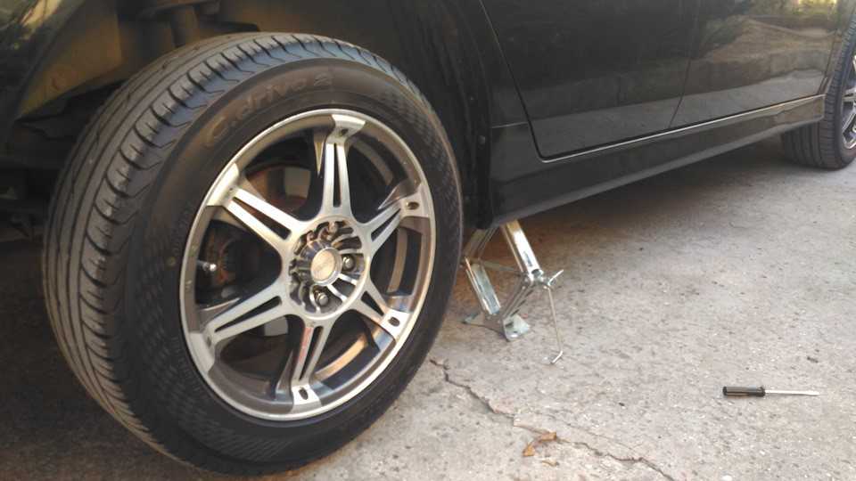 - Поддомкратить противоположное колесо и также отрегулировать стояночный тормоз.