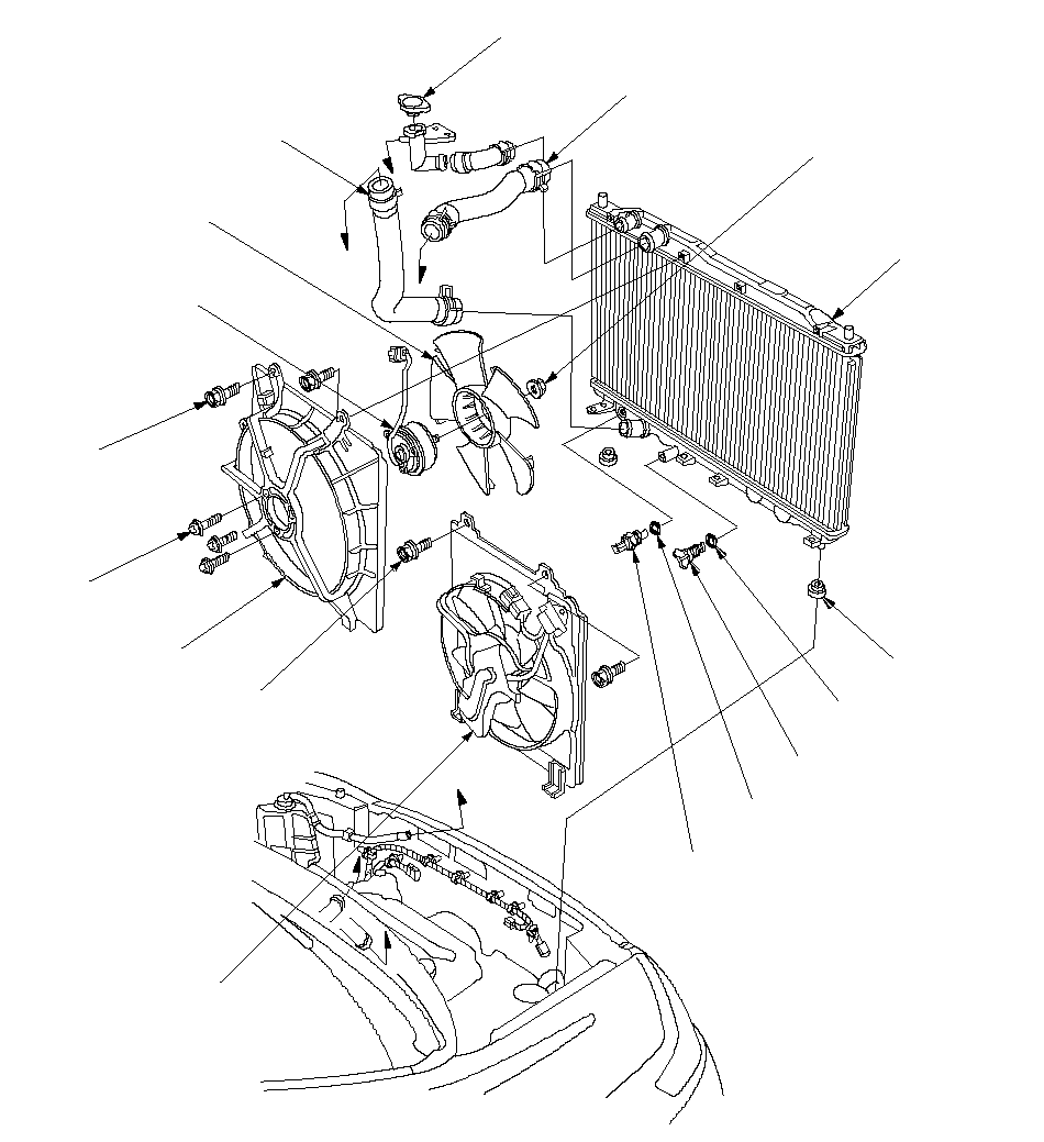 | 12. | Вытащите вверх радиатор, затем отсоедините блок кожуха вентилятора и другие детали от радиатора.