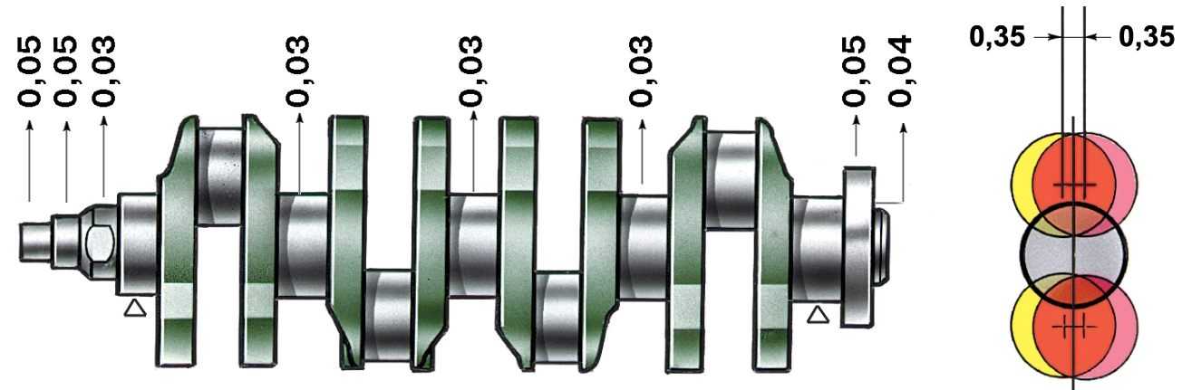 Рис. 2.42. Допустимые биения основных поверхностей коленчатого вала |