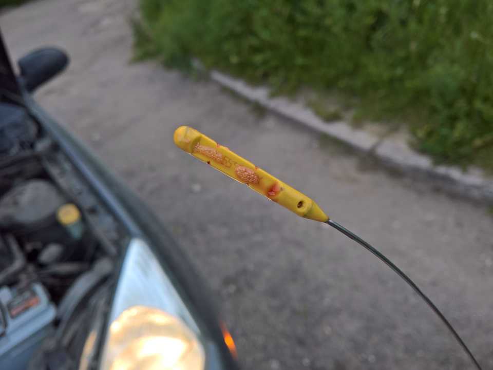 Далее щуп ставят на место и через несколько секунд вытаскивают. Нужно посмотреть, до какого уровня он окрасился жидкостью.