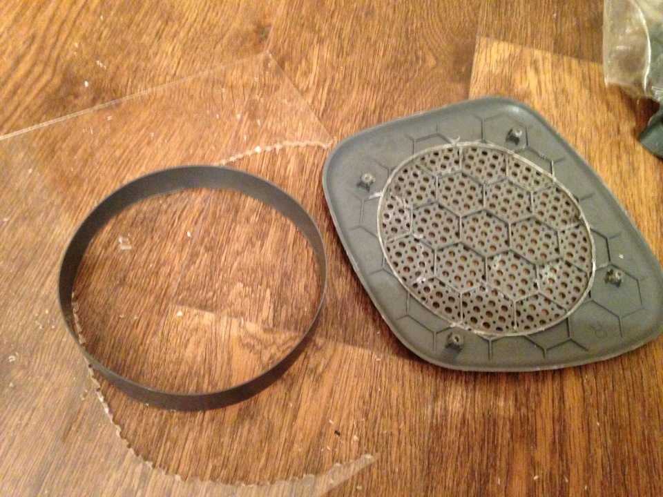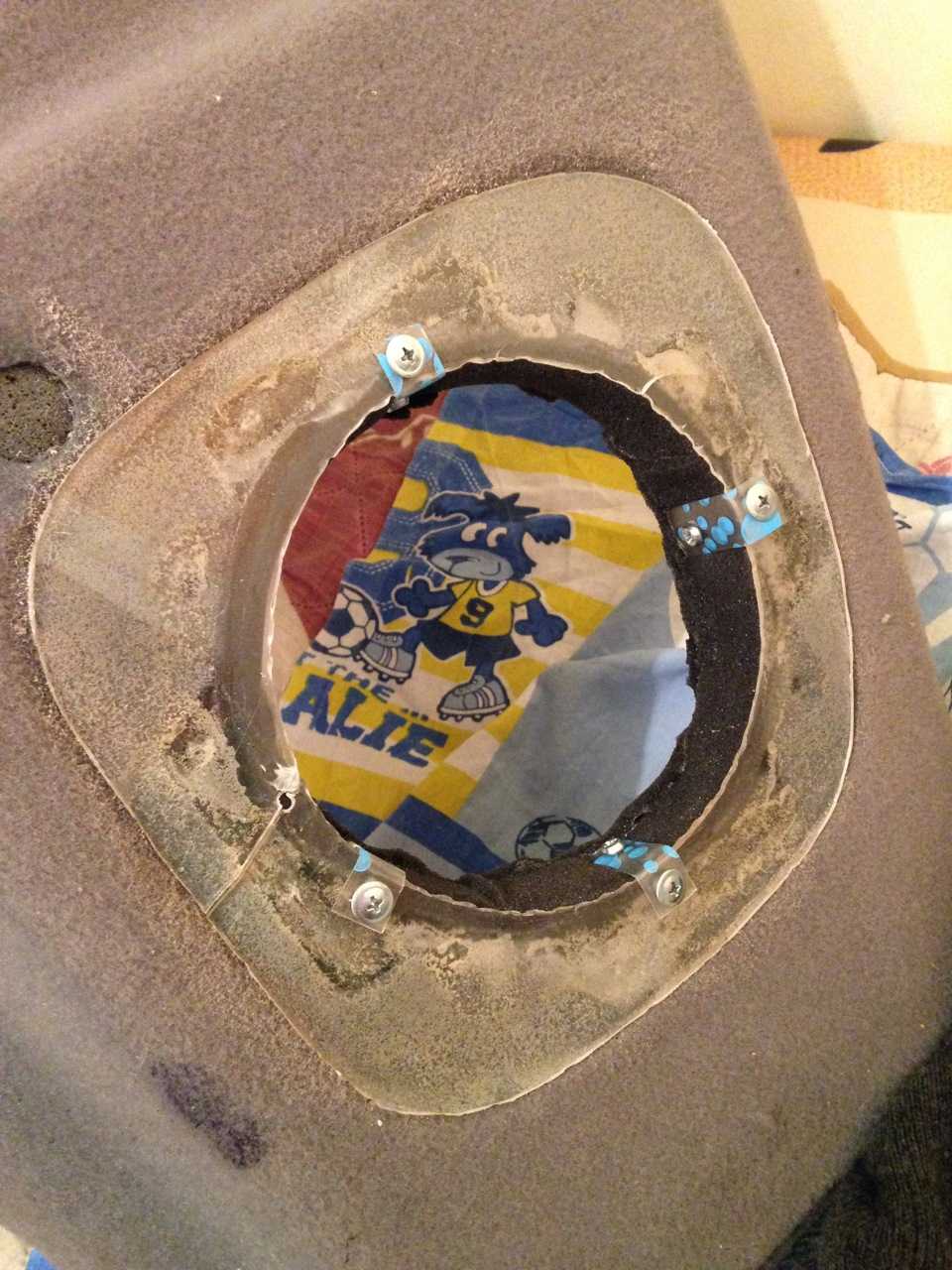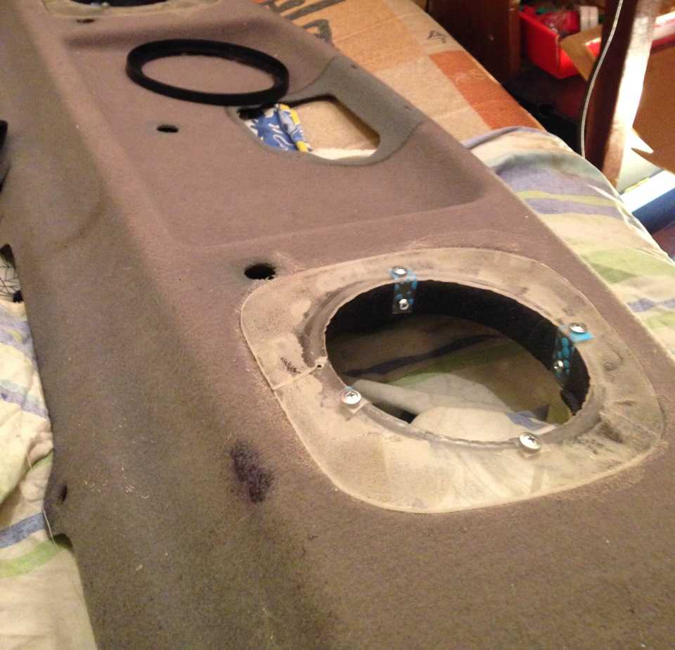 Теперь дело за малым. Обтягиваем карпетом, сажая на спрей-клей. Прикручиваем посадочные бортики от новых сеток, одеваем 4 новые клипсы, отрезаем лишний карпет, прорезаем отверстия под колонки и плафон, прикручиваем плафон и идем ставить на машину.