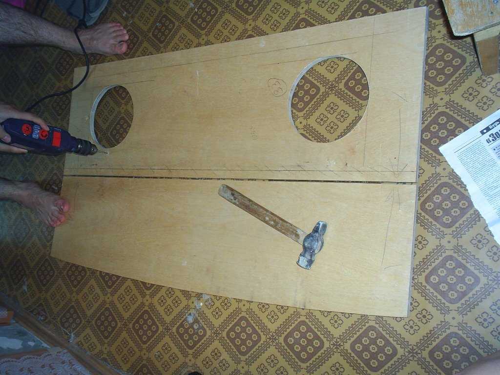 - На фанерный лист наносим все контуры и линии будущего изделия, не забывая про отверстия динамиков, места под задние стойки и резиновую часть заднего стекла;
