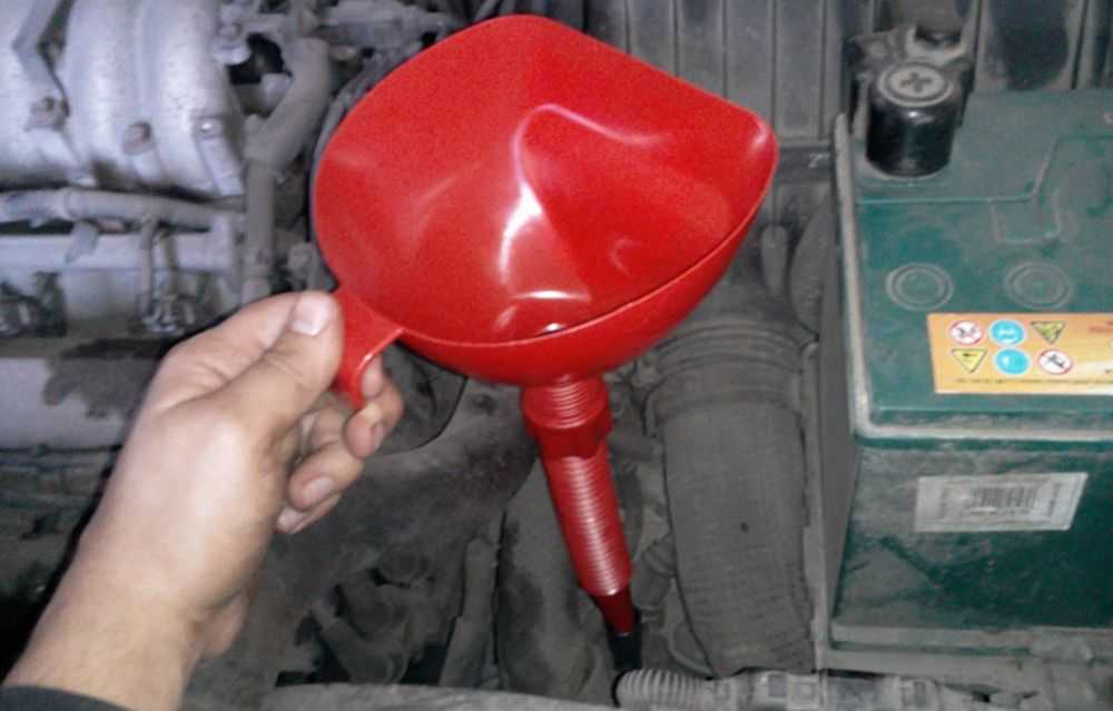 - Далее открывают капот и извлекают щуп. Вместо него в отверстии размещают воронку. При затруднённом доступе допустимо пользоваться резиновым шлангом.