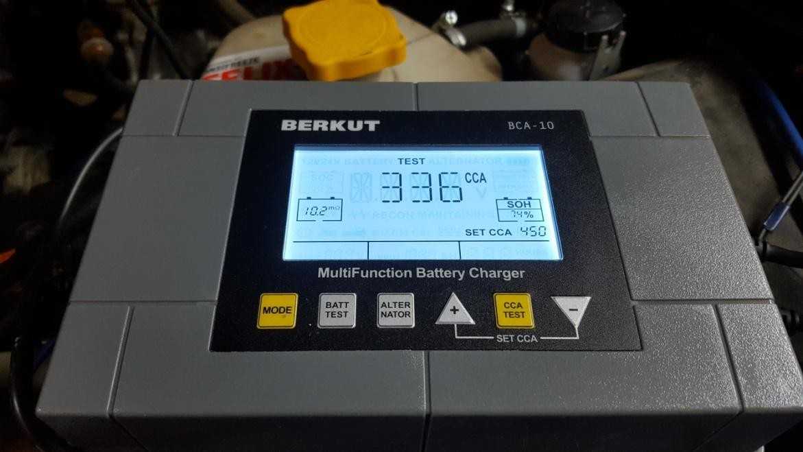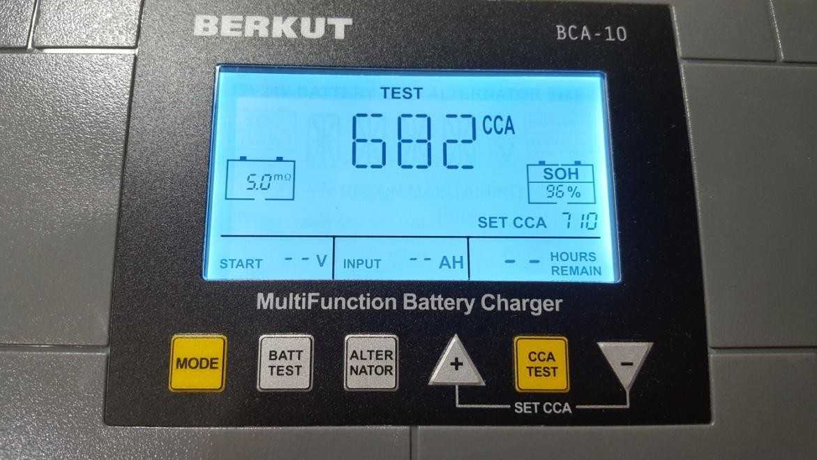 Ну а теперь самое интересное – ради чего все и затевалось! А именно – клавиша «CCA TEST» – главный режим оценки состояния батареи! В этом режиме BERKUT BCA-10 определяет ток холодной прокрутки (максимальный пусковой стартерный ток), который способна выдать батарея в текущем состоянии, а также показывает ее внутреннее сопротивление в миллиомах и «здоровье» в процентах SOH (State Of Health).