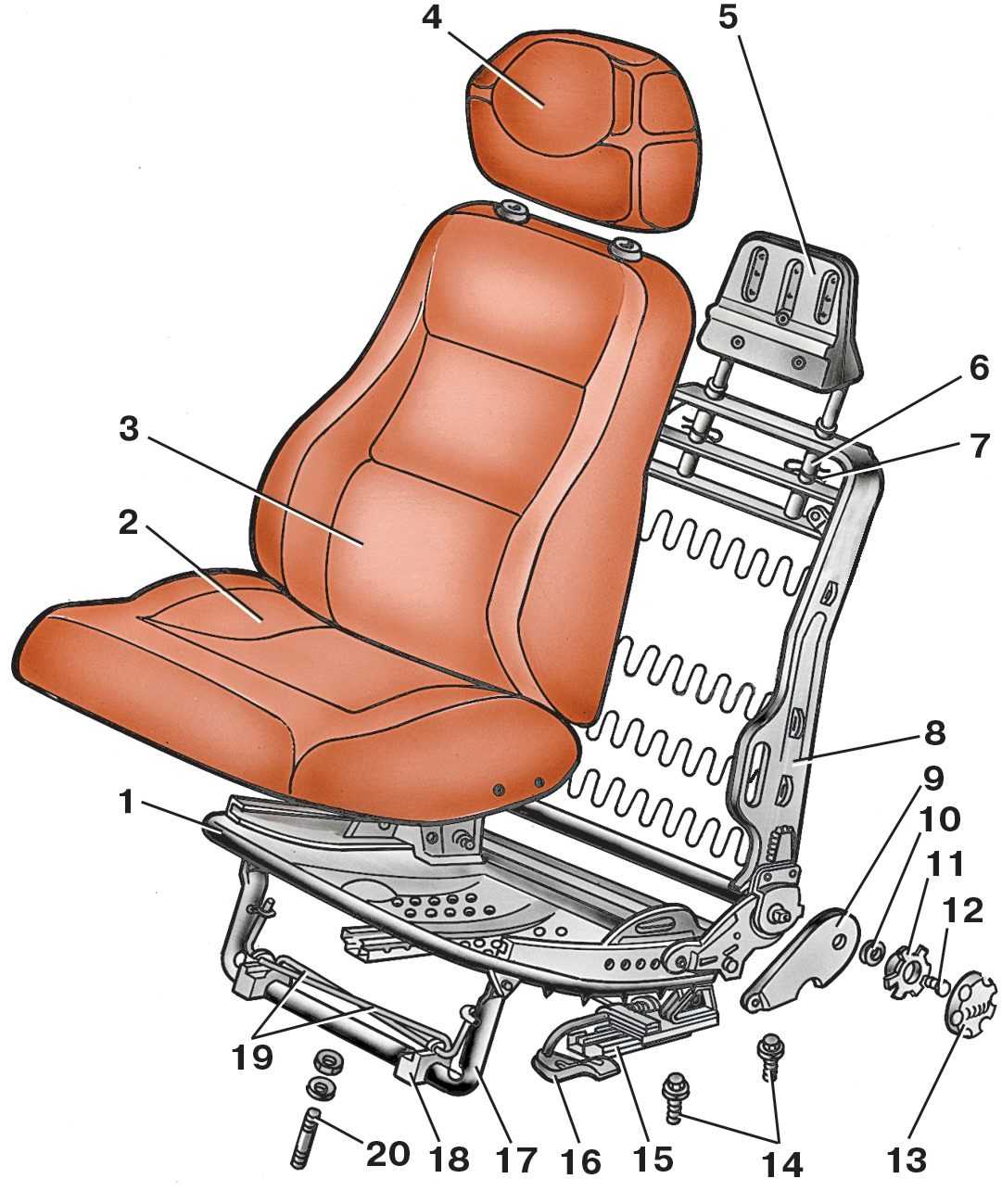 Рис. 8.28. Переднее сиденье: 1 – основание подушки; 2 – подушка; 3 – спинка; 4 – подголовник; 5 – каркас подголовника; 6 – шплинт; 7 – направляющая подголовника; 8 – основание спинки; 9 – облицовка механизма регулирования наклона спинки; 10 – прокладка; 11 – держатель ручки механизма регулирования наклона спинки; 12 – болт крепления держателя; 13 – ручка механизма регулирования наклона спинки; 14 – болты крепления салазок; 15 – направляющая салазок; 16 – ручка механизма передвижения; 17 – стойка основания; 18 – передний кронштейн; 19 – торсионы; 20 – шпилька крепления кронштейна