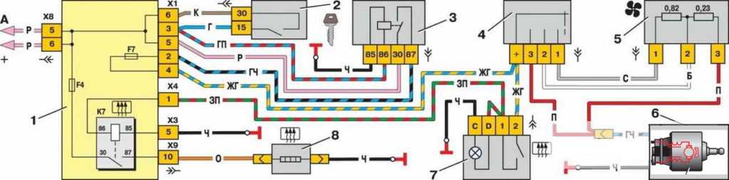 Схема работает следующим образом. При повороте ключа в замке зажигания (2) включается его разгрузочное реле (3). С разгрузочного реле подаётся питание предохранитель f7 в монтажном блоке (1). После предохранителя питание идёт на выключатель обогрева заднего стекла (7) и переключатель скоростей вентилятора (4), который распределяет на какой из резисторов (5) дальше пойдёт питание. Выход 1 с переключателя (4) соответствует самой медленной скорости обдува, а выход 3 идёт на прямую к моторчику печки (6), т.е. самая высокая скорость обдува.