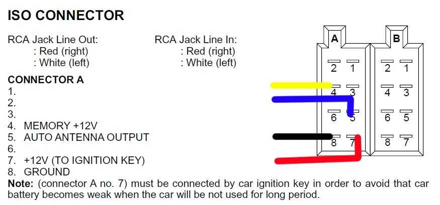 Итак, если проводится замена, то данное несоответствие надо учесть обязательно. Кстати, если установленная ранее автомагнитола страдает проблемой несохранения настроек, то перекинув местами 4 и 7, можно ее решить.Можно вообще решить раз и навсегда проблему с ключом, осуществляя подключение. Например, многим водителям известна ситуация, когда они слушают любимую музыку, автомобиль останавливают, вынимают по привычке ключ из замка и мелодия резко обрывается. Неприятно – не то слово! Проблема данная решается просто, как в остросюжетном кино: перекусывается красный провод, тот, который питание на замок подает. И схема подключения в этом случае выглядит вот так в автомобилях Опель Астра или Омега: