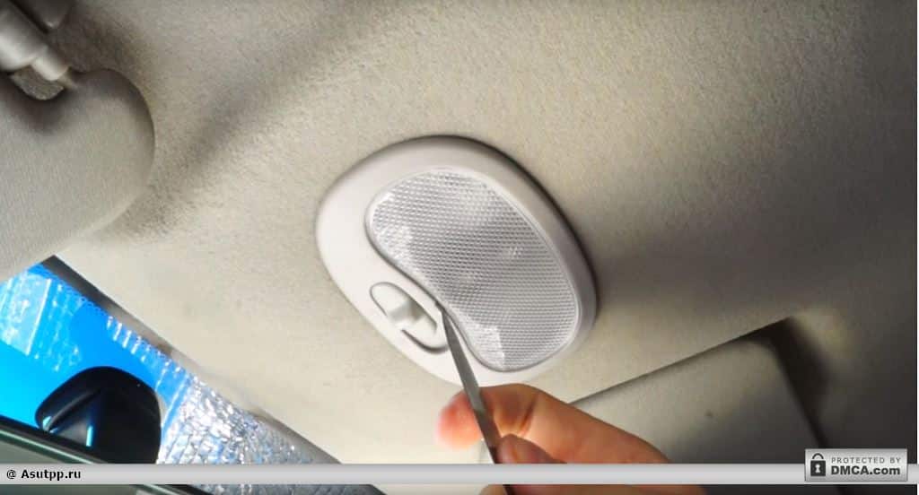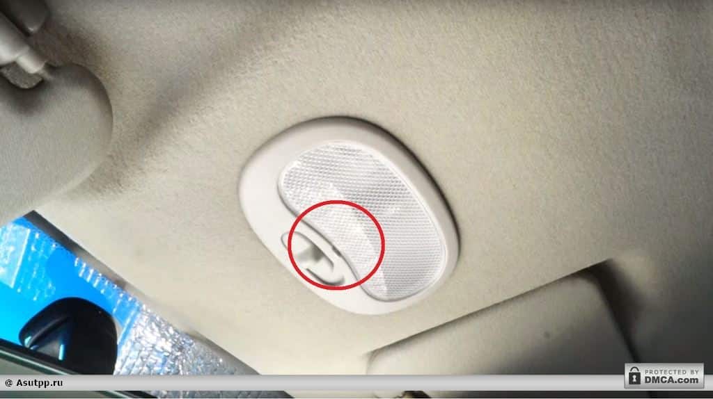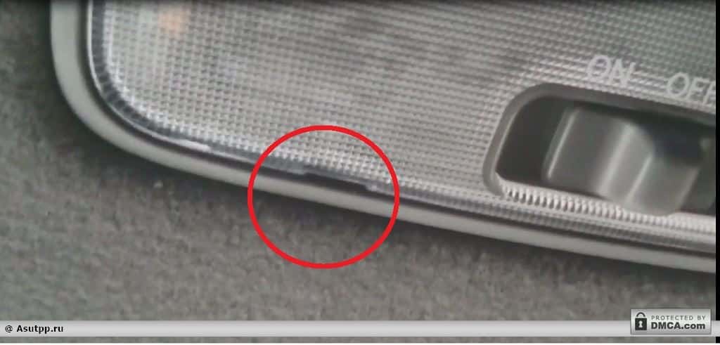 Как видите, возле выключателя находится небольшой паз, выделенный на рисунке красным кругом. Для того чтобы снять рассеиватель, его необходимо поддеть любым плоским предметом. В данном примере ножом поддеваешь плафон и прилагаешь небольшое усилие по направлению внутрь салона.