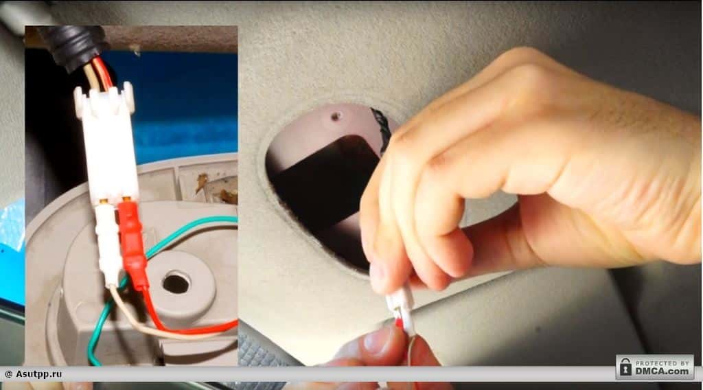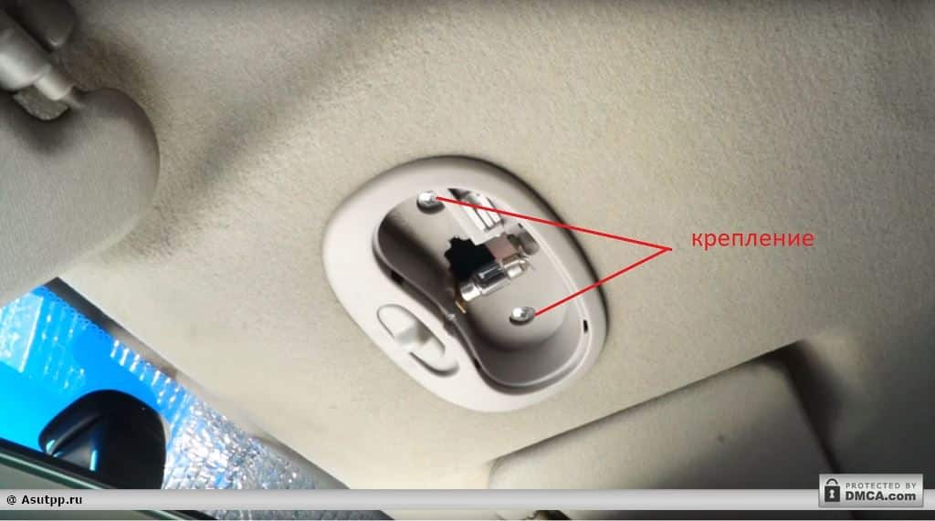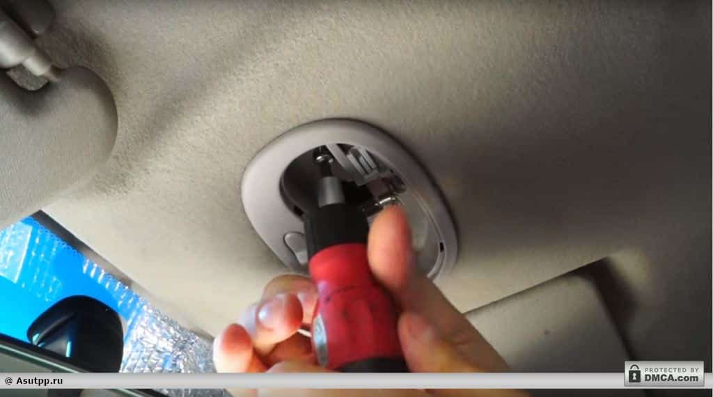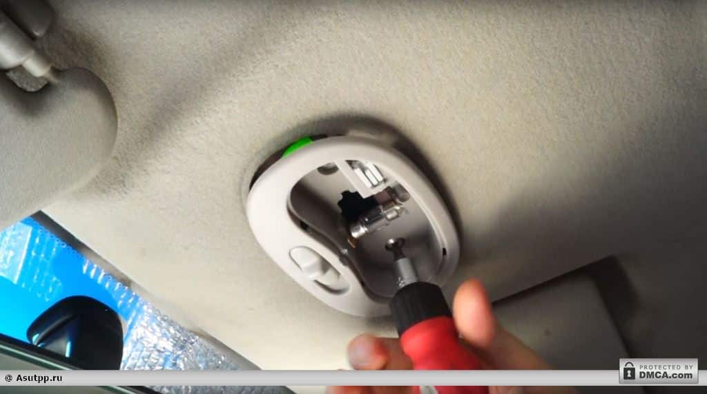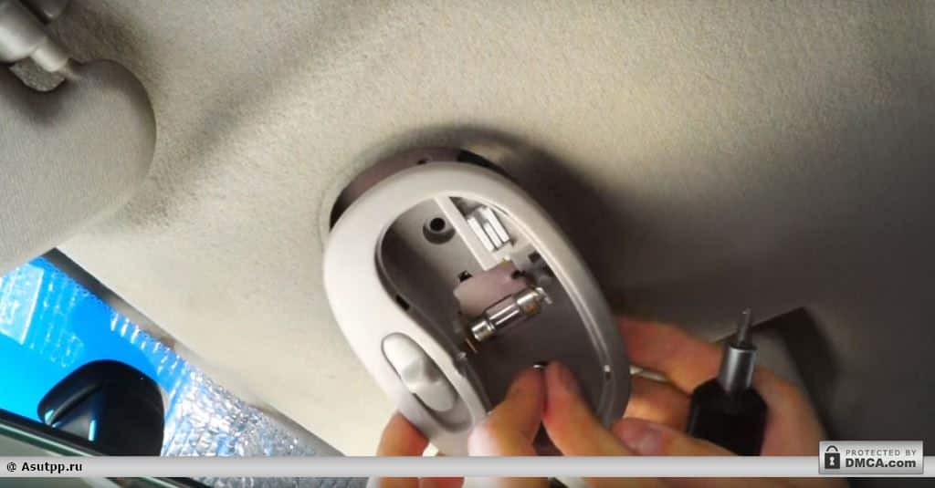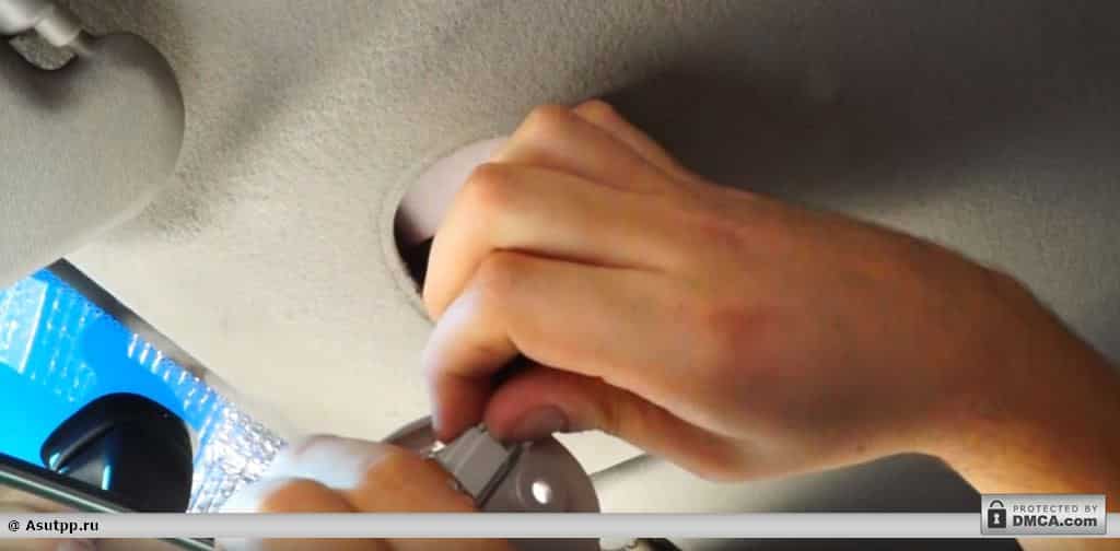 - Меняем лампочку в центральном плафоне. Основная лампа вытягивает легко, а вот боковые находятся в дополнительных боковых фиксаторах. Боковую лампу необходимо отсоединить от бортовой цепи, а затем повернуть на 45 градусов.