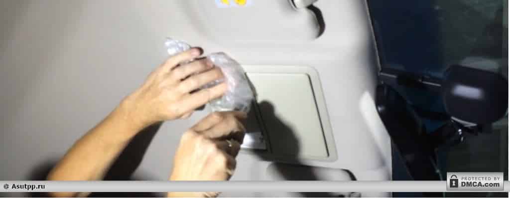 - Проводим демонтаж плафона над центральной консолью. Поддеваем фиксатор и аккуратно вынимаем стекло рассеивателя. После этого можно отжать фиксаторы основной части плафона и вынуть его наружу.