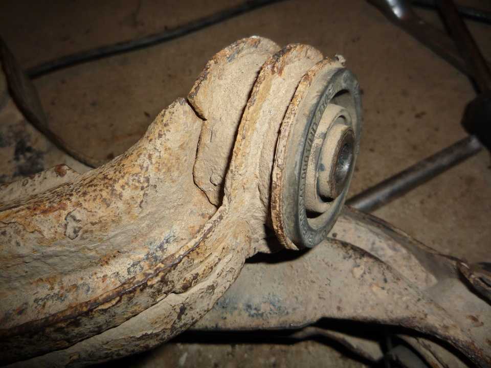 - Выкручиваем болты и вытаскиваем рычаг. Запоминаем как было запресованно. У меня сайленты были установлены широкими “шляпками” снаружи. Пока все было разобрано, почистил подрамник с рычагами и все болты.
