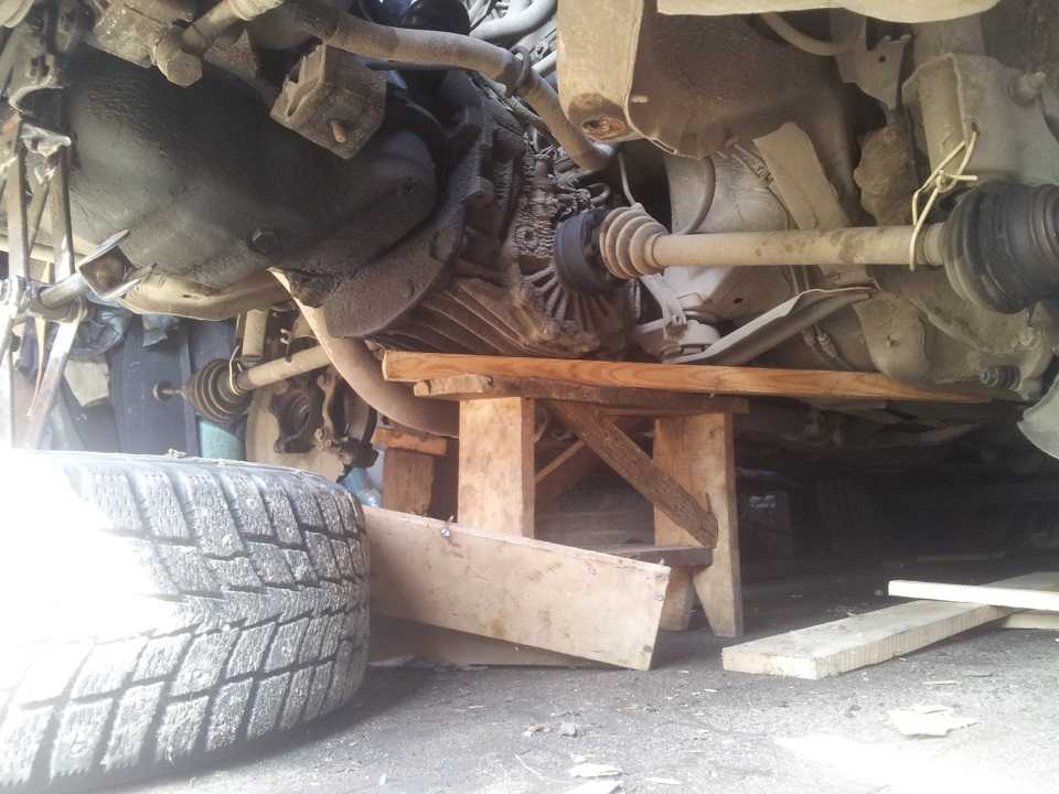 Важно! Работу следует продолжить после установки под кузов надёжных металлических подставок. Далее необходимо установить подставку под коробку передач