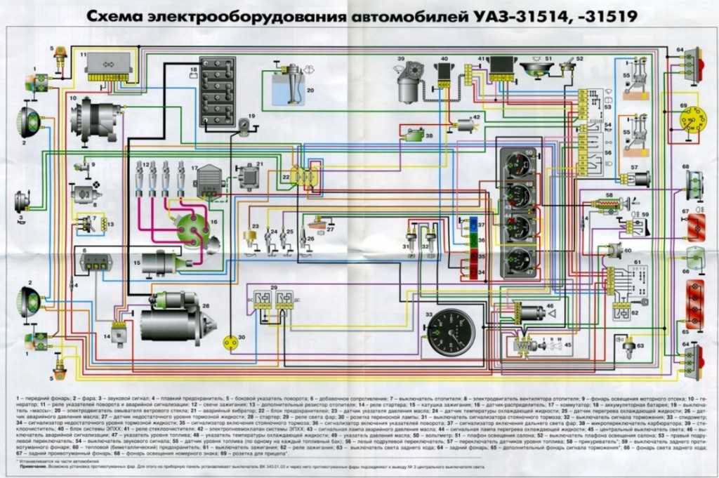 Для перенастройки и эксплуатации вам потребуется и новая схема проводки УАЗ 31514,которая приведена ниже на фото, и которую вы можете распечатать для удобства.