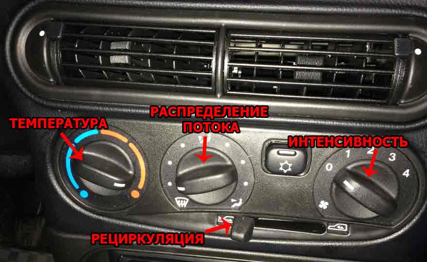 Водитель управляет интенсивностью подачи воздуха, установив скорость вращения вентилятора, температурой воздуха (регулирование заслонки) и распределением воздуха. Также на панели имеется рычаг включения рециркуляции.