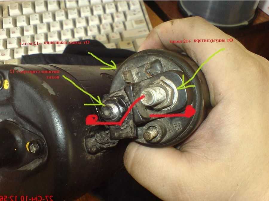 Короче, эта падла гаечка чуток раскрутилась, там под ней гроверок, и вот там неконтакт был, видны были под гровером следы поджогов. Чтобы самостоятельно проверить бендикс, понадобится замкнуть два силовых контакта на тяговом реле.
