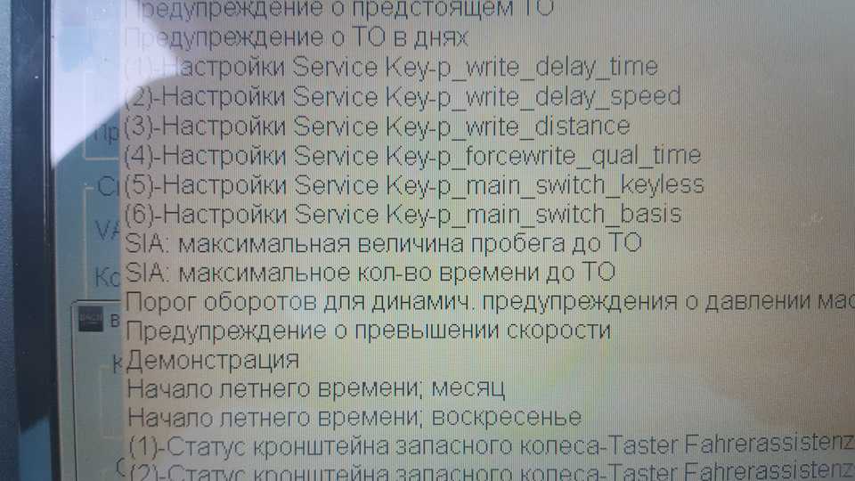 Настройка интервалов и сброс сервиса:ESI: distance driven from inspection : Преодолённое расстояние после замены масла. Установить на «0 км».ESI: maximum value km-driving distance/inspection : Максимально преодолённое расстояние до осмотра. Установить на «0 км».ESI: maximum value of time between inspections : Максимальное время между осмотрами. Установить на «730 дней».ESI: minimum value km-driving distance/inspection : Минимально преодолённое расстояние от осмотра. Установить на «30.000 км».ESI: minimum value of time between inspections: Минимальное время между осмотрами. Установить на «365 дней».ESI: oil quality: Установить «good oil quality».ESI: Resetting ESI: Установить «reset».ESI: soot entry: Установить на «0 км».ESI: thermal load: Установить на «0 км».ESI: time from inspection : Время после замены масла. Установить на «0 дней».FIX: Distance covered since last mileage-depended inspection: Преодоленное расстояние после осмотра. Установить на «0 км».FIX: Max. distance until next mileage-related inspection: Интервал осмотра в км. По умолчанию «30.000 км».FIX: Maximum time until next time-depended inspection: Интервал осмотра в днях. По умолчанию «730 дней».FIX: Reset value for next mileage-depended inspection: Установить на «30.000 км».FIX: Reset value for next mileage-depended inspections: Установить на «365 дней».FIX: Time since last time-depended inspection: Время после осмотра. Установить на «0 дней».SIE: maximum Value of distance to service: Интервал замены масла в км. По умолчанию «15.000 км».SIE: maximum Value of time to service: Интервал замены масла в днях. По умолчанию «365 дней».