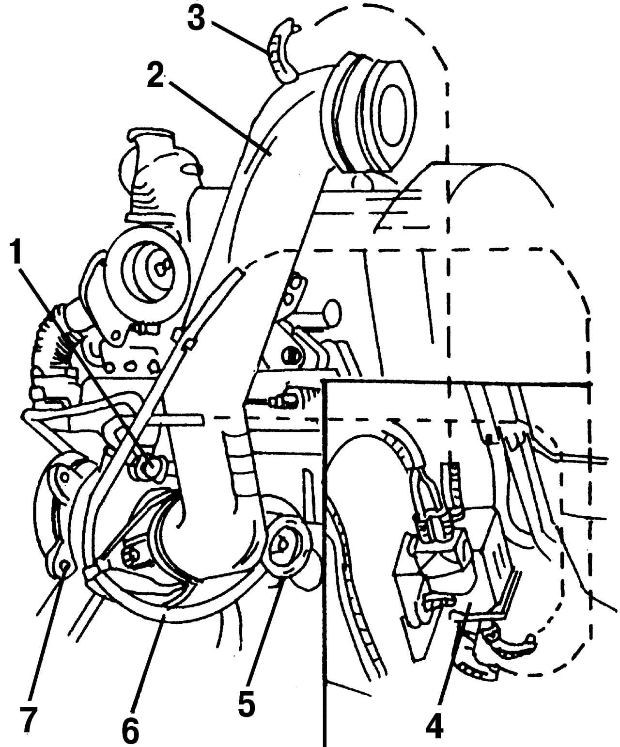 Рис. 483. Отсоедините шланги 1 и 2 для снятия турбокомпрессора |