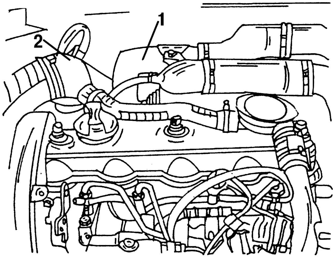 — снимите воздушный шланг между впускным коллектором и местом соединения турбокомпрессора с радиатором нагнетаемого воздуха, а также шланг между воздушным фильтром и турбокомпрессором. Это шланги 1 и 2 (рис. 483);