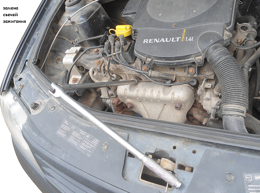 На двигателе k7j и двигателе k7m автомобиля Рено Логан глубокие свечные колодцы, расположенные в передней его части по ходу автомобиля. В них довольно быстро скапливается грязь, песок и разный мусор, летящий с дороги. Всю грязь из свечных колодцев необходимо тщательно вычистить, так как если при замене свечи песок из колодца через свечное отверстие попадет в камеру сгорания — задир стенки цилиндра обеспечен. Для этого при помощи кисти выметаем всю грязь из колодцев после чего продуваем их сжатым воздухом. Для продувки можно использовать колесный насос или компрессор.