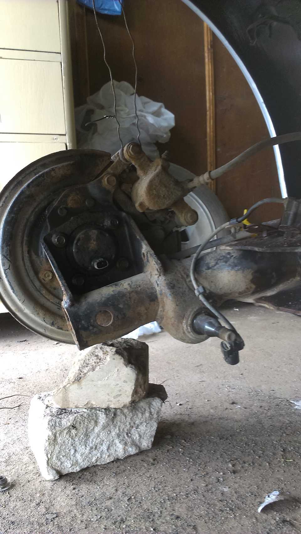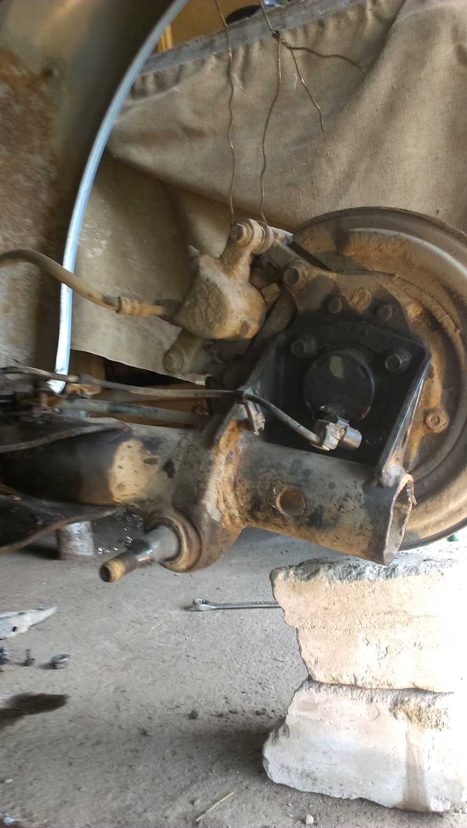 Когда обрабатывал днище и красил бак решил заодно поменять сайлентблоки в задней балке, они были уже совсем уставшие, в одном лопнули два ребра и резинки на половину отслоились от обоймы. Описаний данного процесса довольно много, у меня уже были сняты колёса и стойки, по этому я решил снять балку чтобы было удобней работать. Открутил крепления троса ручника и провода датчика АБС (предварительно всё прыскал WD 40), и снял фишки с датчиков АБС. Далее открутил ступицы, предварительно закрепив их проволокой к кузову.